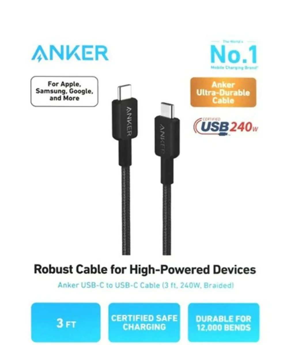 کابل Anker USB-C to USB-C A81D5 یکی از قدرتمندترین کابلهای شارژ انکر است که با پشتیبانی از توان شارژ 240 وات واقعی، نیاز کاربران حرفهای را بهطور کامل برطرف میکند.