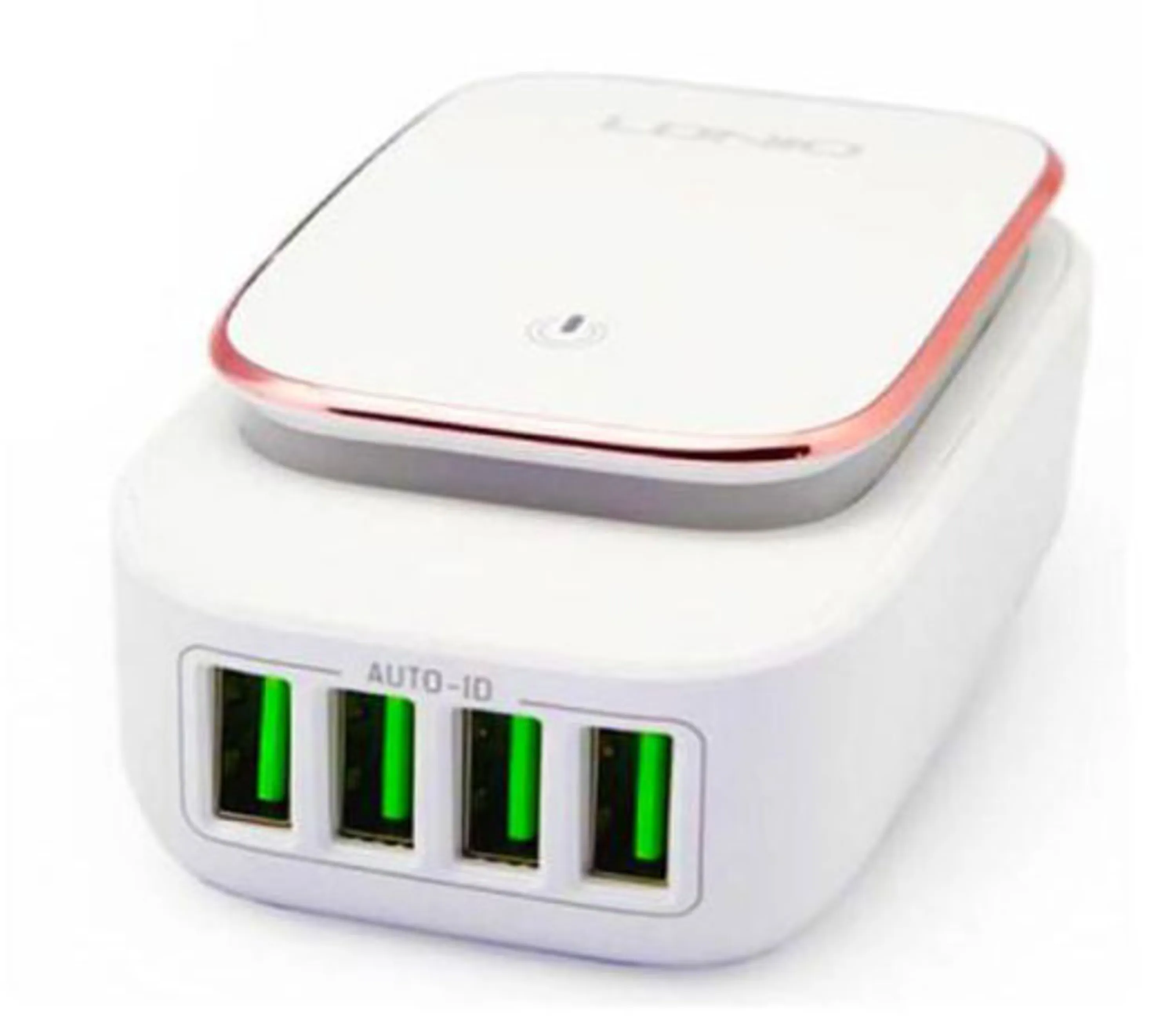 از مزیت های لامپ الدینیو A4405 برخورداری از 4 پورت USB جهت شارژردهی در لبه ی پایینی این محصول می باشد.لازم است بدانید پورت های USB این محصول دارای تکنولوژی Auto-ID نیز می باشند که به رغم وجود این خصیصه این محصول این توانایی را یافته که شدت جریان خروجی را بسته به دستگاه متصل به آن به خوبی تنظیم و کنترل کند و به نوعی سبب افزایش عمر باتری دستگاه متصل نیز شود.توان خروجی این سه پورت 4.4 آمپر و 5 ولت بوده و لامپ LED نیزی دارای حداکثر توان 2 وات می باشد.در ضمن درجه حرارت لامپ این چراغ خواب 6500K می باشد.توسط پورت های USB این محصول می توانید تمامی گوشیهای موبایل، تبلت، پخشکنندههای موسیقی قابلحمل، دستگاههای GPS و ... را شارژ کنید. شارژر دیواری و چراغ خواب مدل 4405 با دارا بودن 4 پورت شارژ قابلیت شارژ 4 دستگاه همزمان را داراست و در ضمن چراغ خواب لمسی این دستگاه در کنار زیبایی خاص کارایی فوق العاده ای دارد و طبق نظر کاربر خاموش و روشن میشود. در این دستگاه از تکنولوژی Auto ID استفاده شده تا آمپر و ولتاژ مورد نیاز دستگاه متصل شده شناسایی شود و طبق نیاز باطری آن شارژ گردد تا از خرابی احتمالی جلو گیری شود.